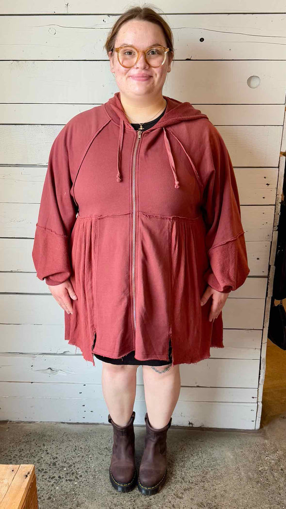 Zip up hooded raw hem sweatshirt dress. Fits true to size.