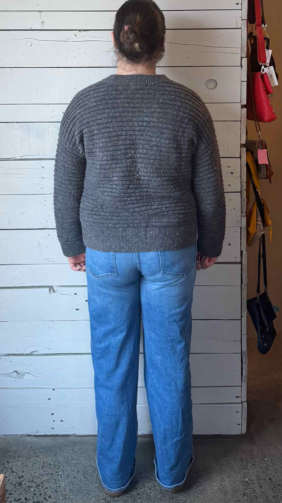 Long sleeve ribbed crewneck sweater. Fits true to size.