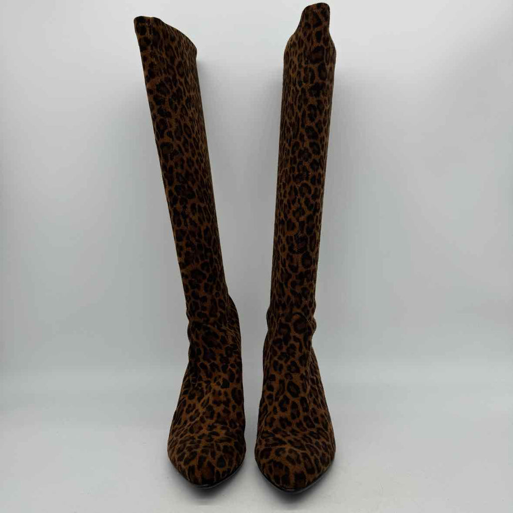 Pointed toe stiletto knee high suede cheetah print sock boot