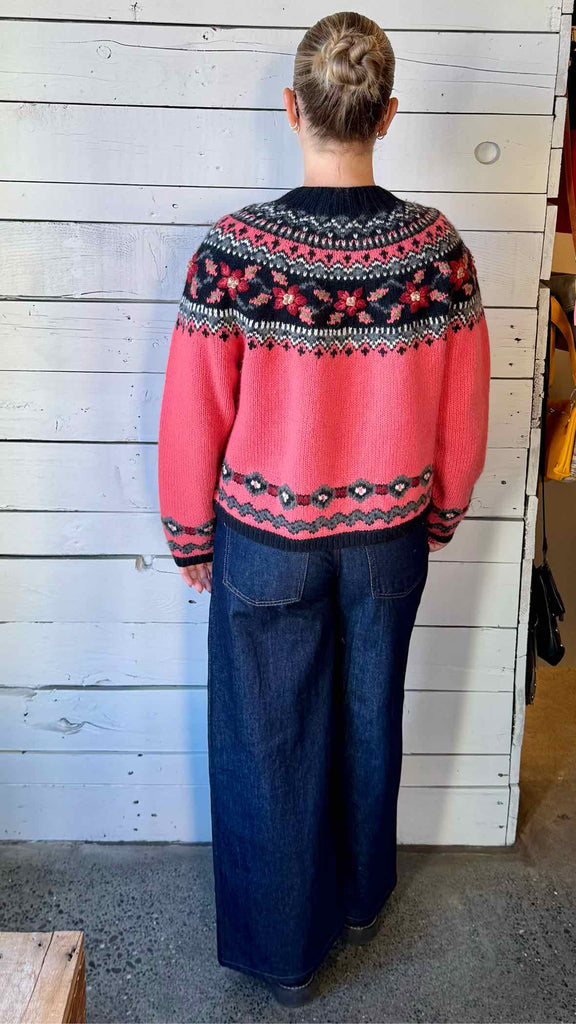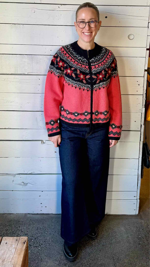 Long sleeve full zip black crewneck floral fair isle design sweater. Fits true to size.