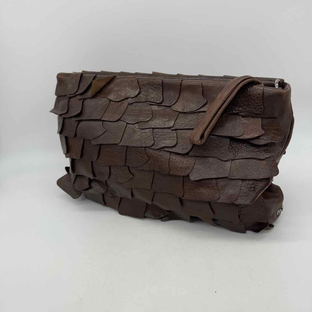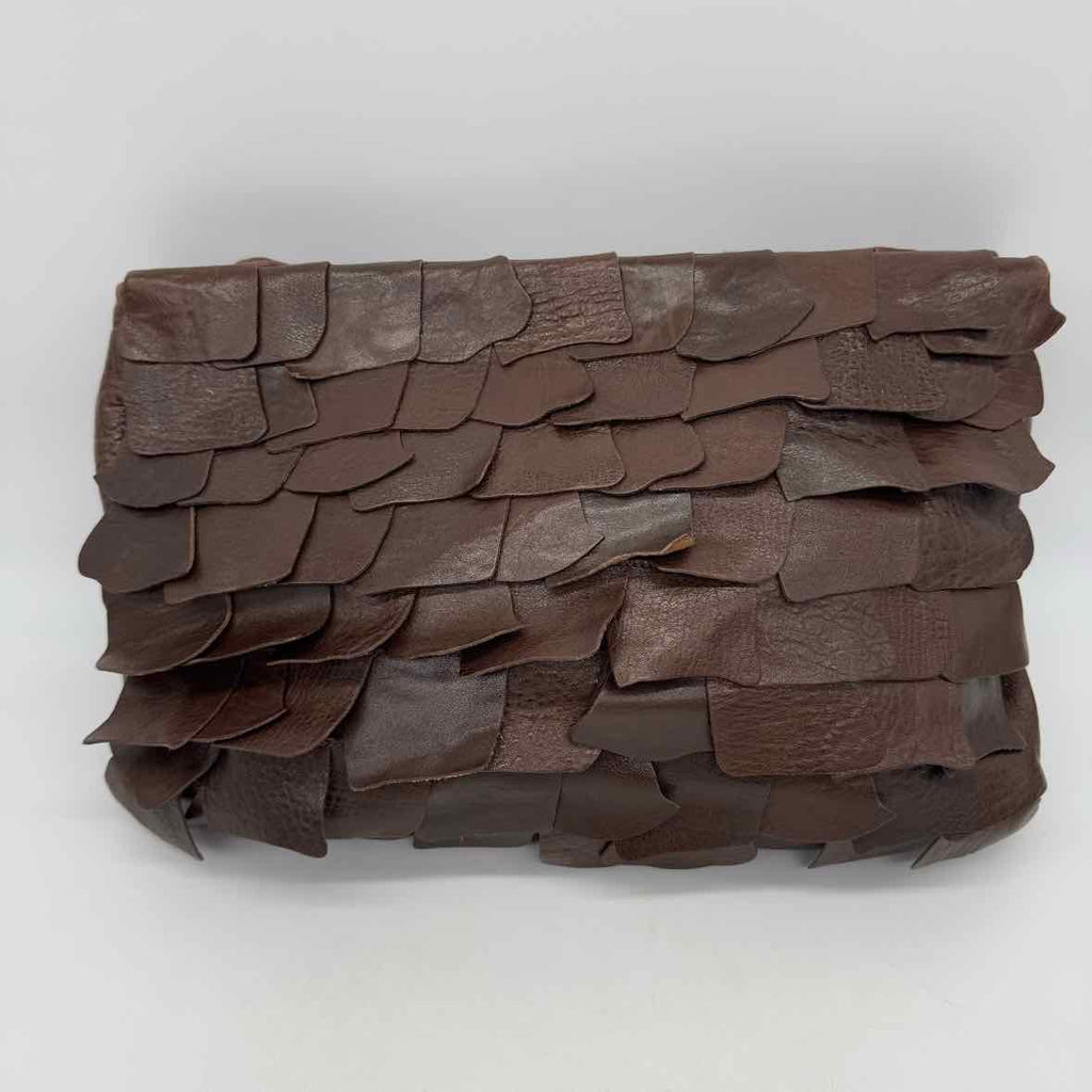 Scalloped leather large clutch with crossbody strap.