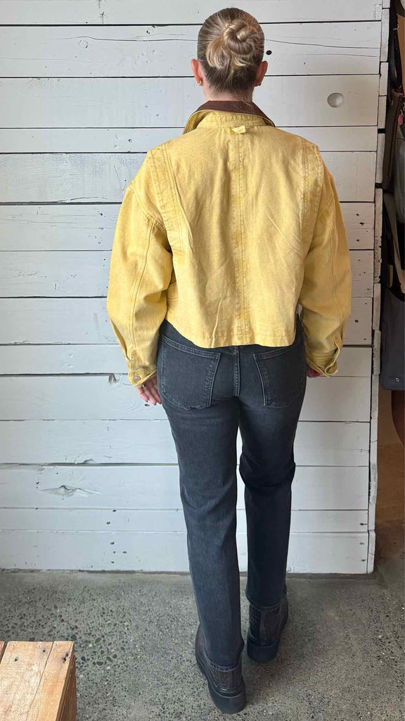 Long sleeve cropped barn jacket with suede trim. Fits true to size.
