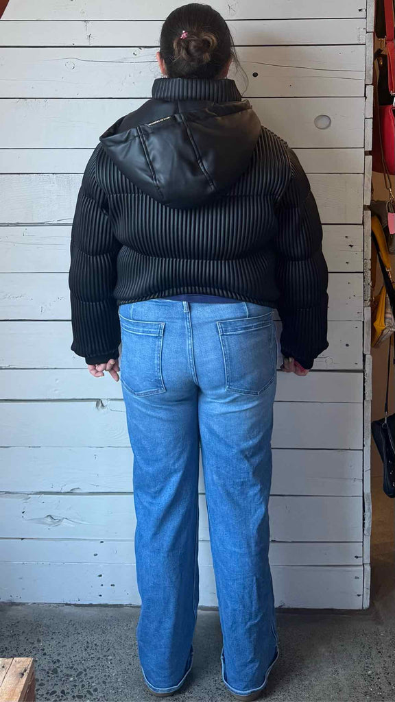 Long sleeve full zip ribbed faux leather. Fits true to size.