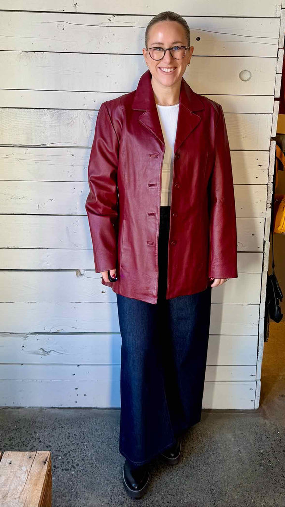 Tribeca Studio long sleeve leather button up short trench coat. Fits like a size medium.