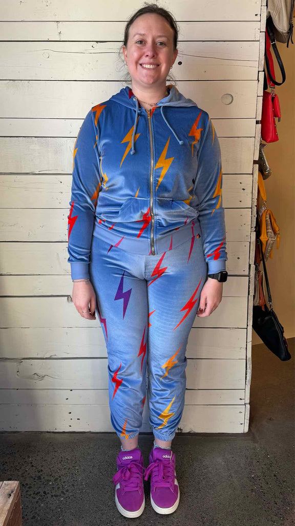 Velour full zip hoodie with lightning bolt print. Fits true to size.