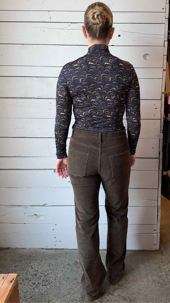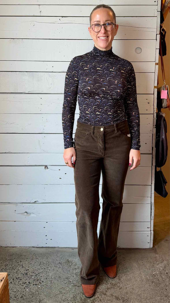 Long sleeve printed mesh turtleneck knit top. Fits true to size.